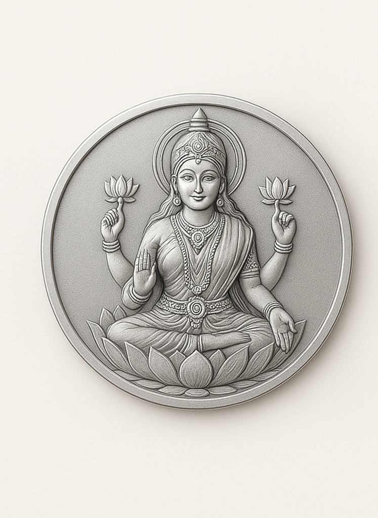 Made from pure silver, this coin beautifully captures the divine grace of Mahalakshmi, the goddess of wealth and fortune. Each detail shines with artistry, symbolizing purity, abundance, and good luck.