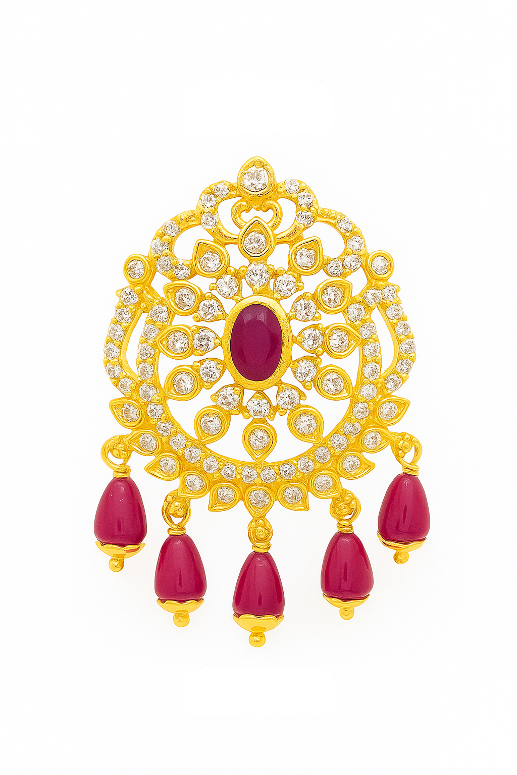Radiate timeless elegance with this 22KT Gold Ruby Pendant, a masterpiece of luxury and craftsmanship. Designed with intricate detailing, the pendant features a central oval ruby surrounded by shimmering Cubic Zirconia (CZ) stones, adding a captivating sparkle. The lower edge is gracefully adorned with five ruby drop charms, giving it a regal and graceful appeal.